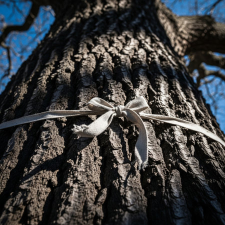 White ribbon tied around a sturdy, deeply textured oak tree trunk under harsh dramatic sunlight.