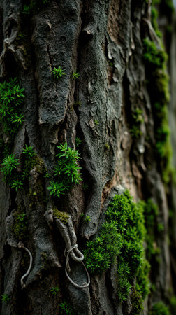 Close-up view of moss and texture on tree bark in a lush forest setting during springtime