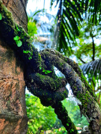 Green algae grows on old ropes wrapped in trees