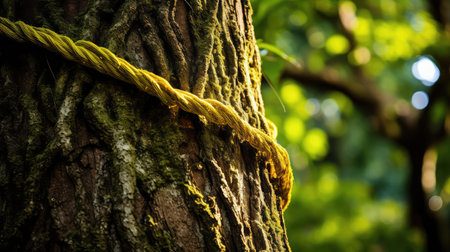 A selective closeup shot of white rope on a brown tree in the forest