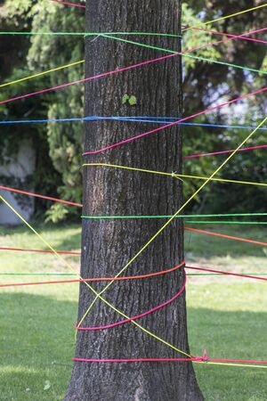Tree with colorful string on the blue sky background, nature concept.