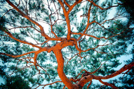 Background with a textured pine tree trunk with branches spreading widely in all directions and a blue sunset sky. The trunk of a coniferous tree with an interesting pattern of branches, worm eye view