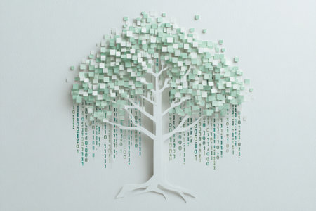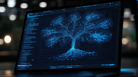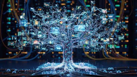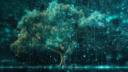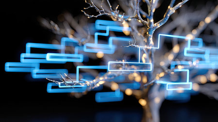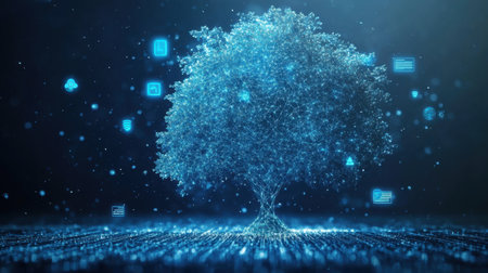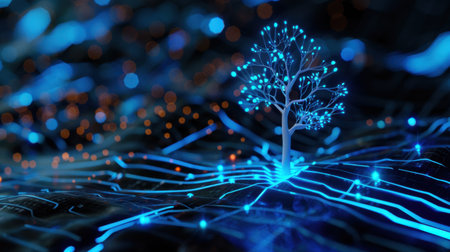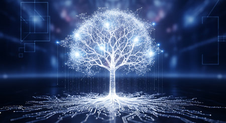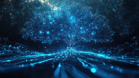 An illustration features a tree constructed from data elements and glowing connections, set against a dark backdrop. The composition showcases blue and white hues, intricate textures, and a central focal point. This graphic is suitable for projects relating to technology, innovation, and digital concepts, with applications across various commercial and editorial contexts.