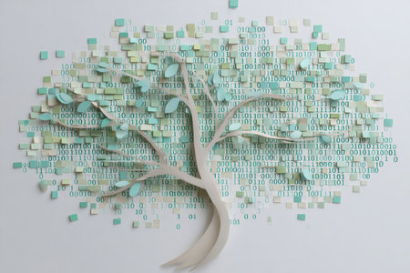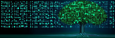 Creative digital tree artwork combines abstract shapes with binary code, symbolizing the harmony between technology and nature. Ideal for modern decor.