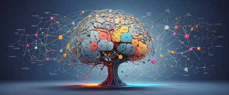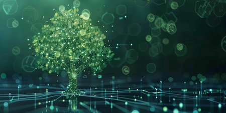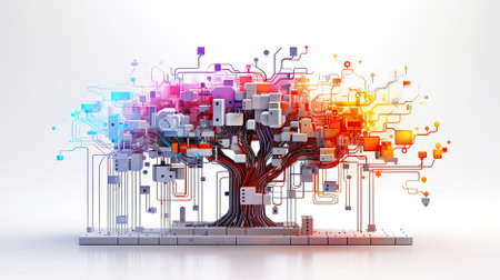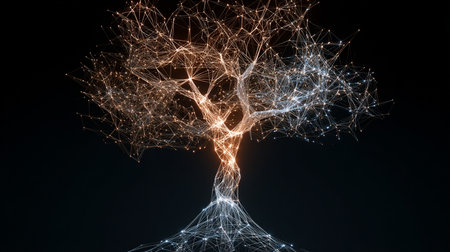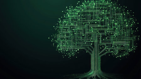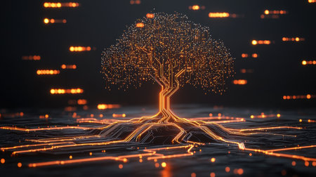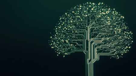 Digital tree network connection technology. Abstract backdrop featuring nodes, connections, and data flow. Artificial intelligence concept illustration.