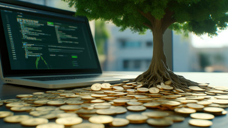 Financial Growth Represented by Dollar Coins and Tree Roots