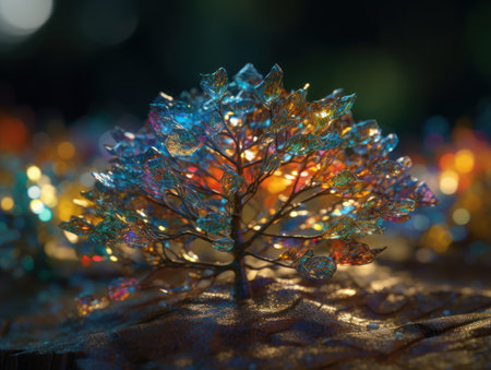 A tree is shown in a digital image with a lot of glowing lights surrounding it