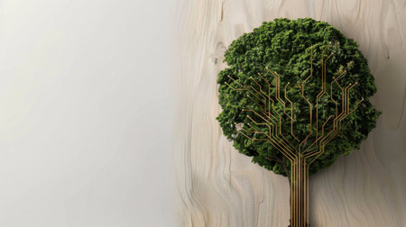 Unique tree design features circuit branches, symbolizing fusion of nature and technology. Soft light tones enhance organic feel, creating harmonious blend of elements