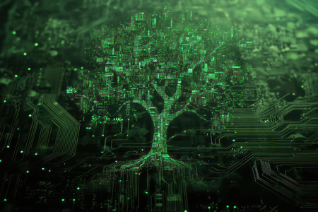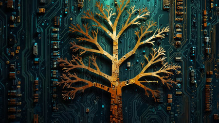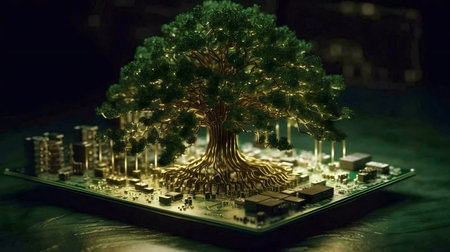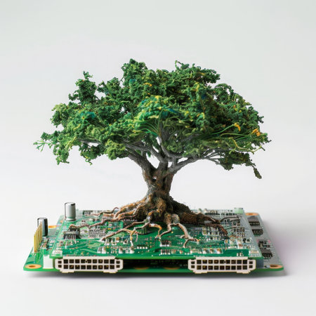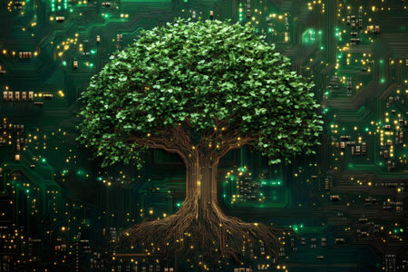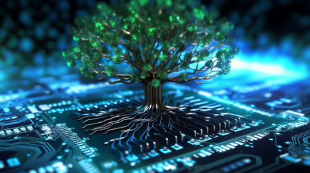 A digital art depicting a tree growing from a circuit board, symbolizing the merging of technology and nature.