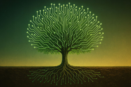 A tree's branches resemble digital circuits while rooted in soil, symbolizing eco-technology fusion.