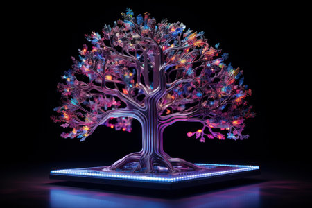 Vibrant 3d render of a neon-lit tree symbolizing technology and nature fusion