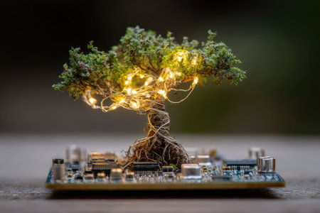 A small tree with green foliage is adorned with warm-toned string lights. It is rooted in a computer circuit board, creating a contrast of nature and technology. The composition features soft lighting and a blurred background. This image can be used for conceptual or illustrative purposes in a variety of design projects.