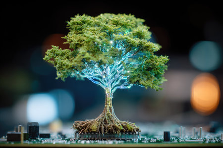 Lush green tree growing on a circuit board, representing the fusion of nature and technology for a sustainable future
