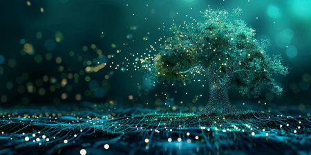 This stunning digital image showcases a tree made of luminous nodes, symbolizing data growth and connectivity within a virtual realm, evoking creativity and innovation.