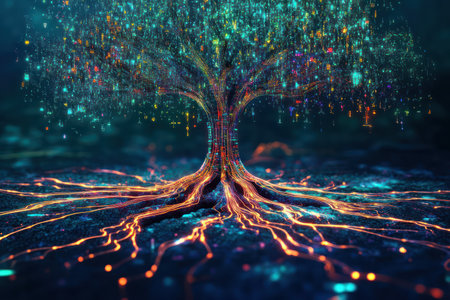 Futuristic illustration of a vibrant tree with glowing digital roots, blending natural beauty with technological innovation.
