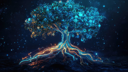 A vibrant tree stands amid a digital landscape, with glowing roots intertwining with circuit patterns. The night scene highlights the connection between nature and technology.