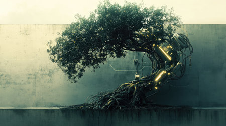 A tree robots glowing roots intertwined with wires, set against a minimalist background, highlighting its fusion of nature and machinery.