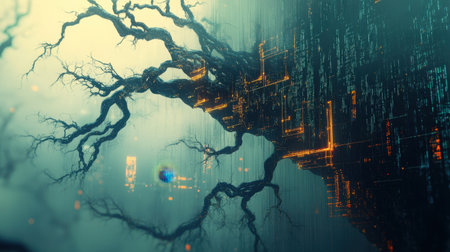 Conceptual fusion of organic tree branches and digital data streams in abstract artwork