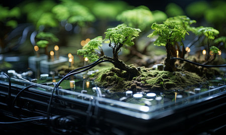 A small plant sprouts from a circuit board, symbolizing the convergence of nature and technology. The image showcases a lush green plant contrasting against a backdrop of electronic components. The composition, utilizing blurred backgrounds, implies an outdoor setting. Suitable for themes related to environmentalism and technology.