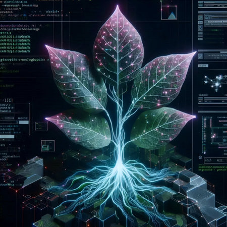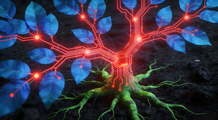 A creative digital illustration depicting Dynamic digital illustration of red circuit fractals branching blue leaves over green roots in black soil, organic tech fusion lighting, branching root system layout, commercial art. This AI-generated artwork features unique visual elements suitable for various commercial and editorial applications. AI-generated illustration.