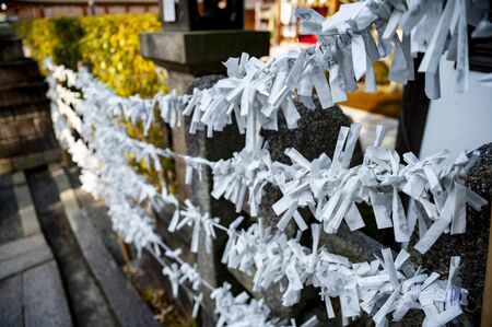 Omikuji (paper strips with random fortunes) at Fushimi Inari Shrine.