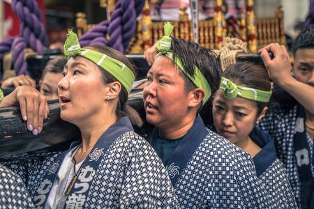 Tokyo - May 19, 2019: People celebrating the Sanja Matsuri festival in traditional clothes in Asakusa, Tokyo, Japan
