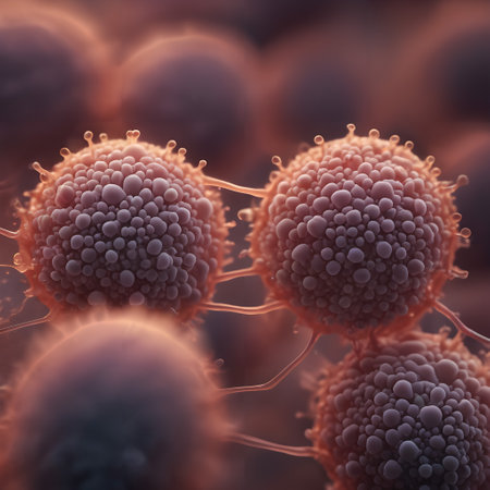 Cells cluster in darkness, softly glowing against a vibrant backdrop