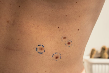 Doctor in medical gloves paint lines around male birthmarks. Preparing procedure for medical surgery. Laser skin tags removal. Prevention of melanoma
