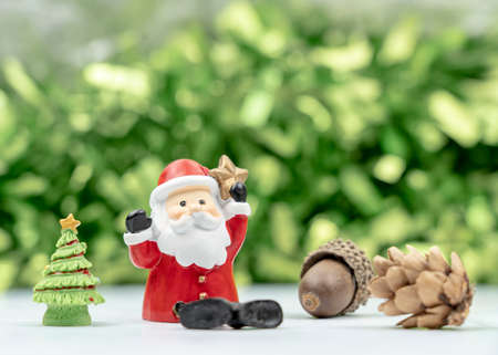 Santa Claus dolls and Christmas decorations on abstract light background with copy space