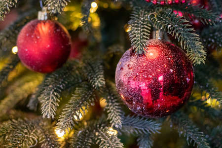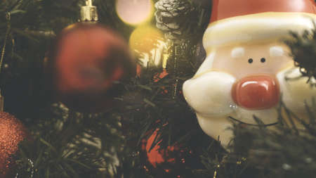 Greeting Season concept.close up of ornaments on a Christmas tree with decorative light
