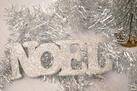 Christmas background with silver tinsel and lettering NOEL in French, New year decorations