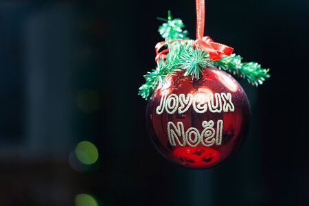 Merry Christmas written in french on a red Christmas ball on a black background