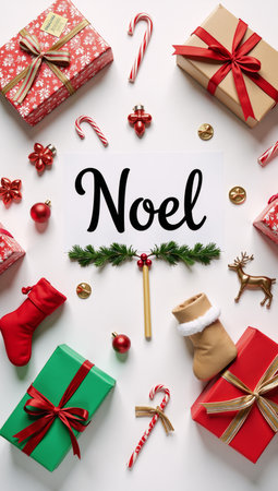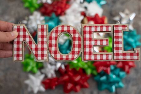 Hand holding the word Noel in plaid lettering with de-focused gift package bows in background. Christmas holiday concept