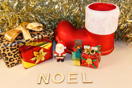Santa Claus figurine, gifts, boot, tinsel and the word christmas written in french language