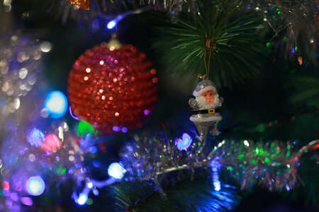 New Year's toys hang on the Christmas tree, festive decoration on the tree of Santa Claus sock, balls