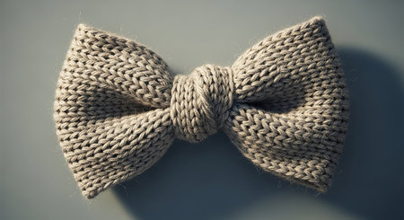 A close-up of a beige knitted bow tie with a textured surface and soft lighting. Clear details and vibrant col...
