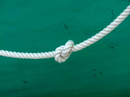 Hemp rope with a knot on a light blue background. Marine subjects. Sports and recreation. Close-up. Copy space.