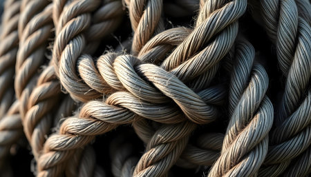 Close-up view of a tightly bound rope knot, highlighting textures and details against a dark background, perfect for representing strength and connection.