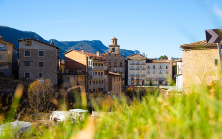 Picturesque houses on the river bank Llobregat. La Pobla de Lillet. Spain