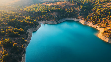 Aerial panoramic view of a water reservoir in the Mediterranean for times of drought.
