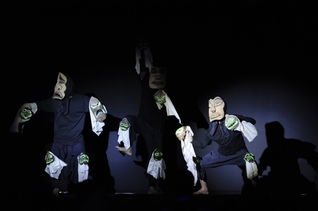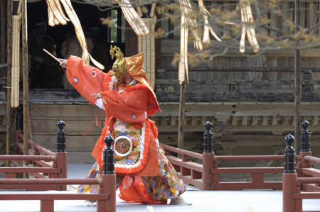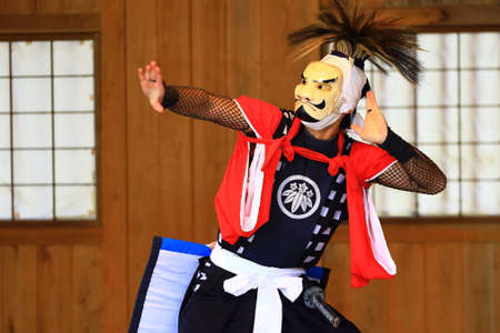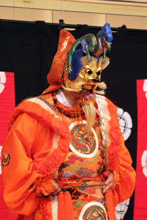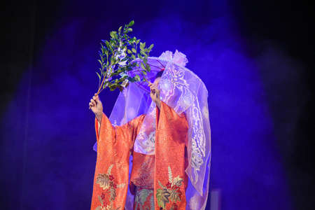 Japanese theater actors perform oriental traditional dance.