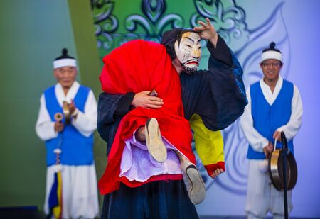 ANDONG , SOUTH KOREA - OCT 01 : Actors performing the traditinal Korean Maskdance at Andong South Korea on October 01 2018 , The Maskdance festival held in Andong annually