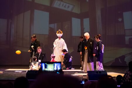 VLADIVOSTOK, RUSSIA - NOVEMBER 17, 2018: Actors present a performance of a traditional Japanese wedding during the Fourth Festival of Japanese Culture in the Far Eastern city of Primorsky Krai, Russia, Vladivostok. Live News