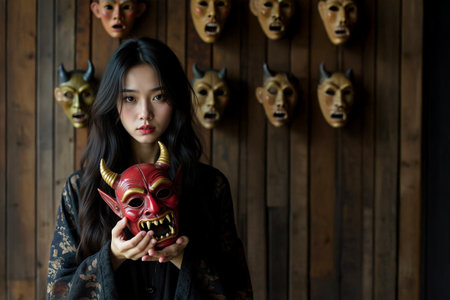 A young woman in black holds a red Japanese-style demon mask in a dimly lit room with an old-looking wooden wall behind her, with many demon masks hanging from it.
