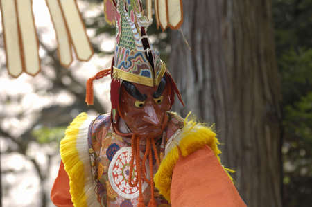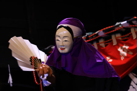 Japanese actor wearing a traditional costume and mask during a theatrical performance in a japanese garden