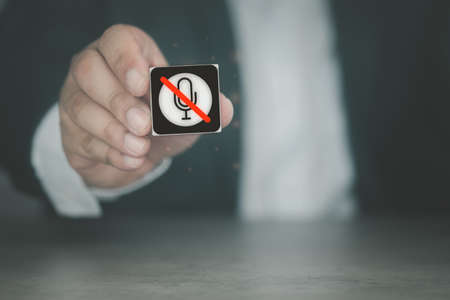 Businessman in suit holding an icon of the mute microphone. Does Not record or use microphones