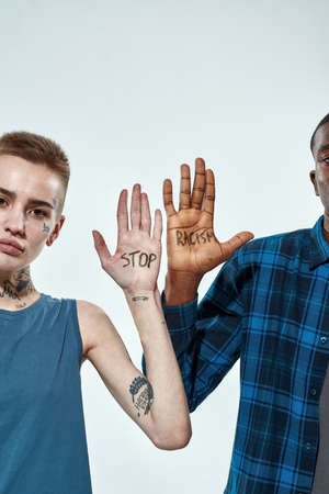 Stop shaming. Racial tolerance. Respect social unity. African and caucasian hands gesturing on gray studio background. Human rights, friendship, intenational unity concept. Interracial unity.