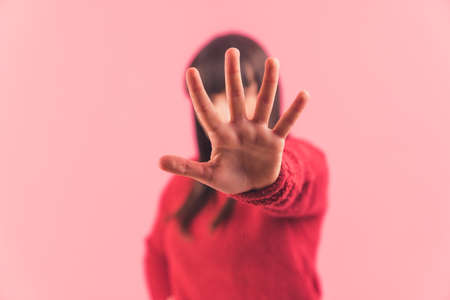 Stop sign, palm, hand on camera, symbol. Focus on the foreground. Studio shot with pink background. High quality photo