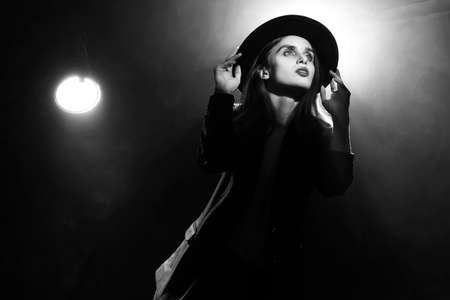 Beautiful braless actress girl, wearing an unbuttoned blazer and a hat, poses and dances in the warm light rays of scenic illuminators in the theatrical fog. Artistic, monochrome, noir design