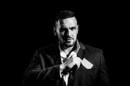 Businessman showing a credit card. Banking services. Closeup of torso of confident business man wearing elegant suit.